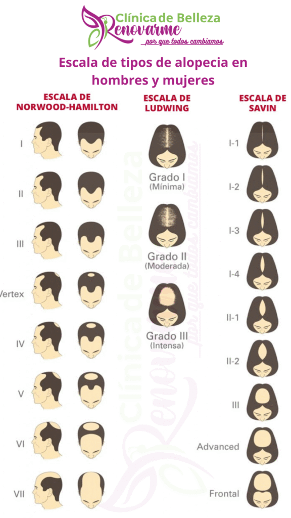 Alopecia androgenética: La más frecuente, hereditaria y progresiva. Afecta tanto a hombres como a mujeres.